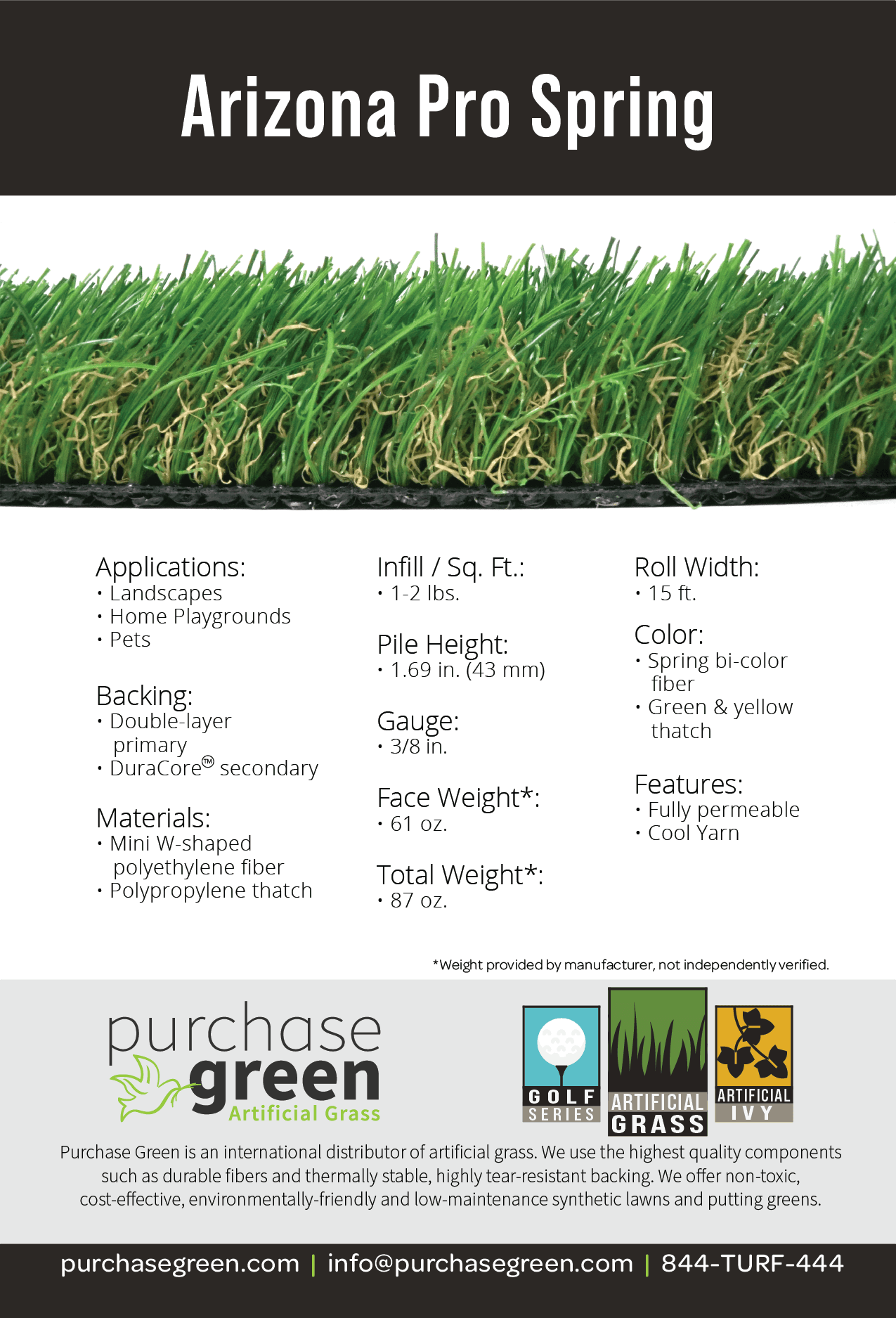 Arizona Pro Spring is a vibrant artificial grass with a Spring Green bi-color combination and a mixed green and yellow thatch. Featuring a durable mini-W blade shape and 1.7 inch pile height, this artificial grass is perfect for residential yards, playgrounds, and pet kennels.
