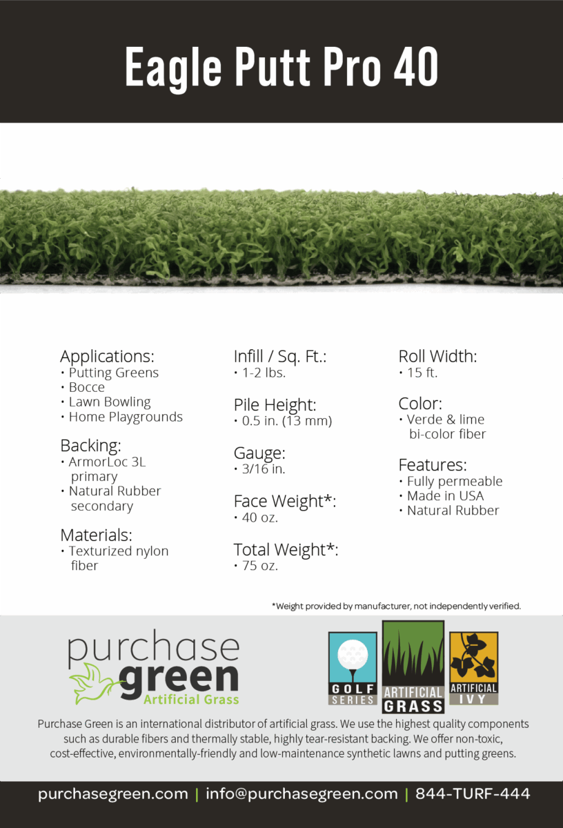 Designed to replicate a natural putting green, Eagle Putt Pro is constructed from verde and lime color nylon fibers and is the perfect choice for golfers wanting to practice their short game. It requires minimal maintenance and can withstand all types of weather. Standard features of this artificial grass include realistic texture and appearance, ultraviolet resistance, durability, permeability, consistent ball roll, and a stimp rating of 11-12 with no infill.