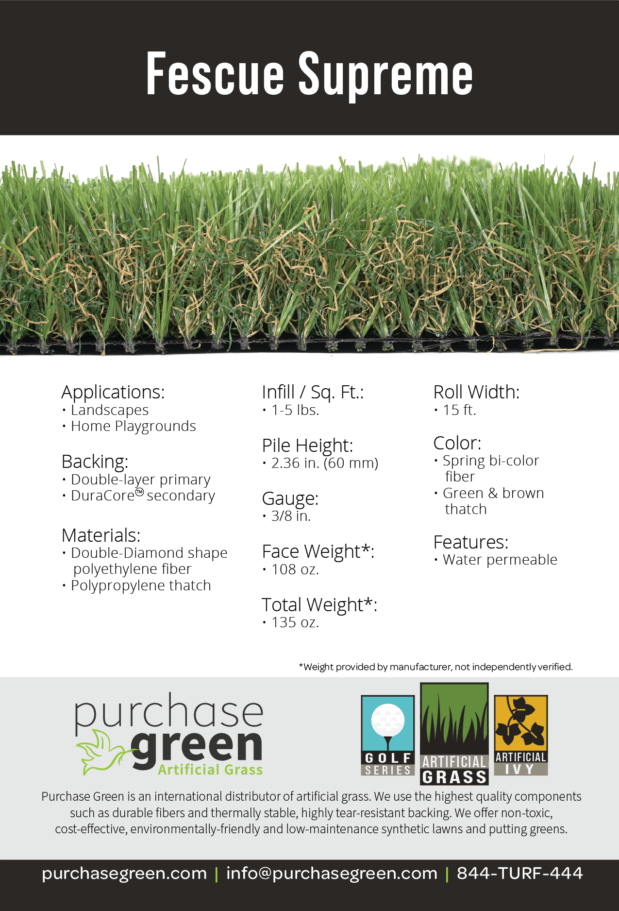 Fescue Supreme is one of the tallest, lushest and most durable artificial grass products on the market today. It uses the latest technology in yarn extrusion. The Double Diamond-shaped blade is designed for superior memory – a key characteristic for this nearly 2.4″ tall (60mm), 108 oz face weight product. It is a delustered fiber so there is no shine. It is a very natural looking olive bi-color grass with an olive green and brown thatch.